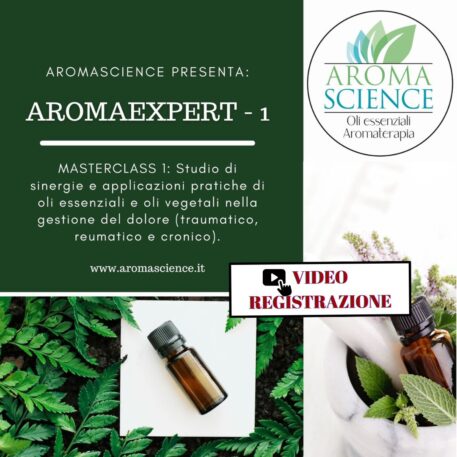 VIDEOREGISTRAZIONE DELLA MASTERCLASS 1 del corso avanzato AromaExpert. Serata di Lunedì 23 febbraio 2026. Studio di sinergie e applicazioni pratiche di oli essenziali e oli vegetali nella gestione del dolore (traumatico, infiammatorio, reumatico, neuropatico, tensivo, fibromialgico). In questa masterclass approfondiremo ogni singolo olio essenziale evidenziato, studieremo i più appropriati oli vegetali vettore meglio dediti alla gestione del dolore, ci dedicheremo alla realizzazione di blend a differente grado di diluizione a seconda dei casi specifici analizzati. Docente: dr. Alessandra Pagnoni. Attestato di frequenza, videoregistrazione della lezione, dispense sempre incluse, Chat di Supporto WA post corso. Corso Accreditato R.E.O.O. (Registro Europeo Operatori Olistici).